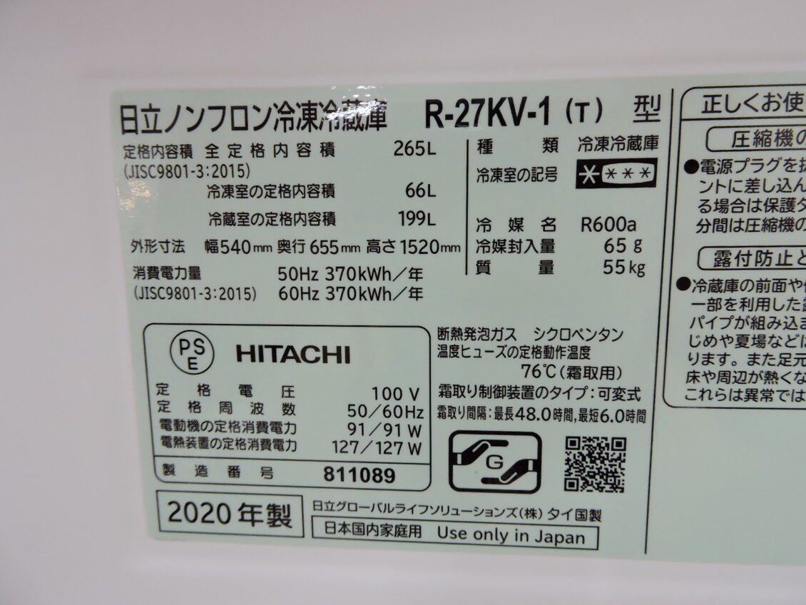 HITACHI(日立) 265L/R-R-27KV-1/2020製 をお買取させていただきました。